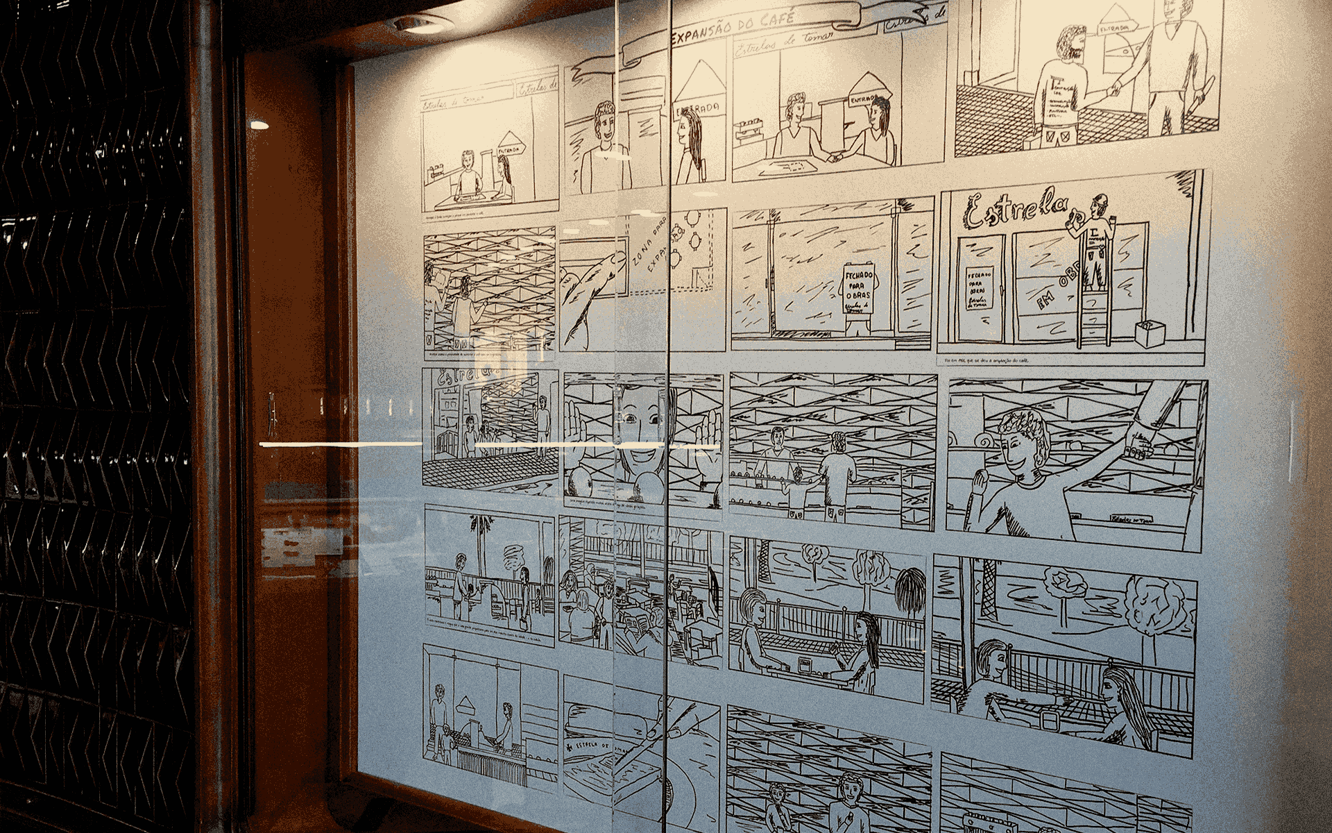 O interior do espaço foi pensado como um “livro vivo” da Estrelas de Tomar. Cinco painéis em banda desenhada contam, com traços simples e emocionais, a evolução da marca, da fundação à nova gerência e expansão. Cada painel é uma página que os clientes podem “ler” e sentir, criando uma ligação genuína com a história.